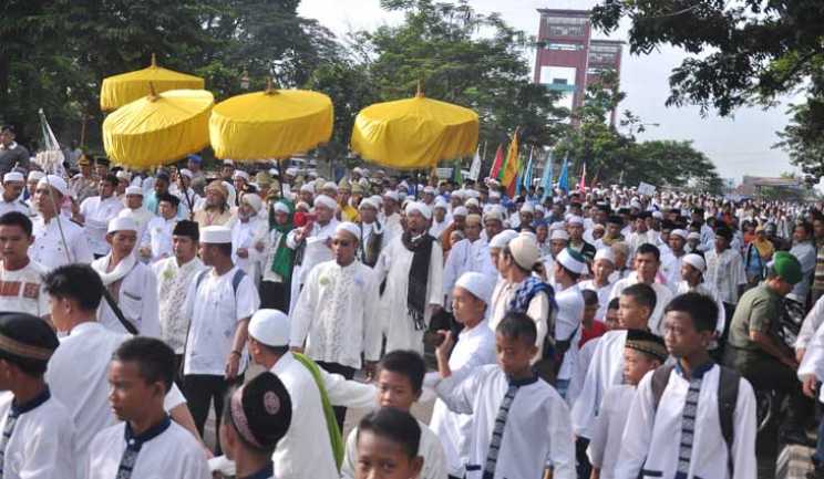 SAMBUT RAMADHAN: Para ulama, habib dan tokoh masyarakat berbaur dengan ribuan umat Islam mengikuti Pawai Ramadhan usai Tabligh Akbar di pelataran Benteng Kuto Besak, kemarin. Foto: Alfery/Sumatera Ekspres