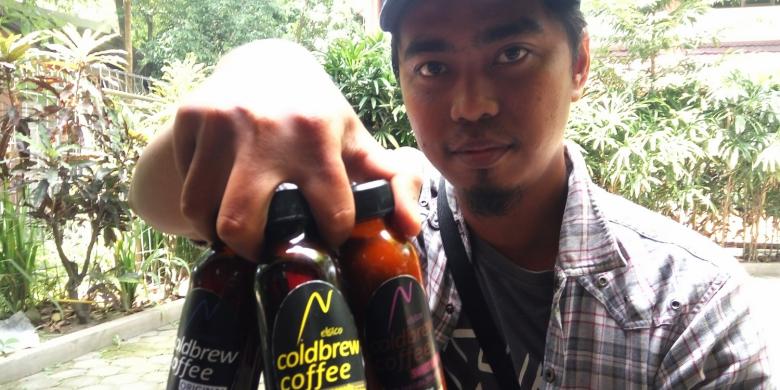 Pratama Adi Winata saat menunjukkan tiga varian produk cold brew coffee miliknya bernama "Elsicoffee".
